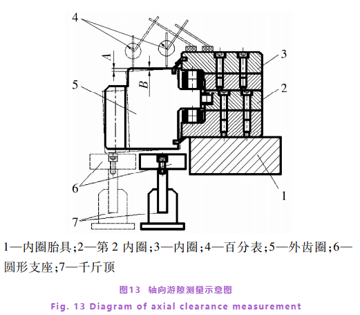 剖分軸承分段拼接,每段外齒圈會因自重下墜傾斜,普通三點測量軸向游隙已不適用。軸向游隙測量如圖13所示,虛線、實線分別為軸承組裝后的實際位置和理論位置。千斤頂與百分表位置均會對軸向游隙產(chǎn)生影響,測得A點值比B點大,B點值更接近實際游隙。采用單點測量軸向游隙,千斤頂與百分表位置靠近軸承內(nèi)圈,在每段中間部位及連接縫處各取1個點,共計12個點或更多,取其平均值作為實測軸向游隙。