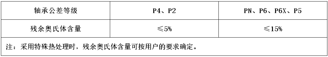 軸承鋼中殘余奧氏體的含量要根據(jù)其服役條件(應(yīng)用工況)來(lái)平衡,對(duì)尺寸精度、耐磨性要求高,可能需要冷處理等工序嚴(yán)格控制奧氏體的含量。GB/T 34891—2017《滾動(dòng)軸承 高碳鉻軸承鋼零件 熱處理技術(shù)條件》規(guī)定的淬回火后的殘余奧氏體含量見(jiàn)下表。
