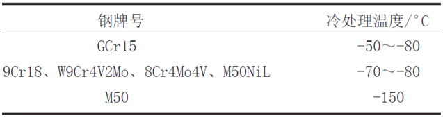 軸承鋼冷處理的學(xué)術(shù)研究上基本都是進(jìn)行深冷處理,文獻(xiàn)[4]給出的常用軸承零件的冷處理溫度見(jiàn)下表,因此,實(shí)際冷處理溫度還需要根據(jù)具體情況深入探討。