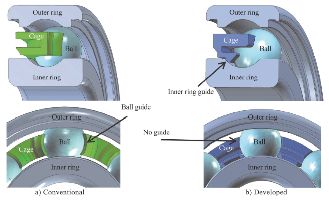深溝球軸承多使用潤滑脂潤滑,以往通過改善潤滑脂推進了軸承低摩擦力矩化,不過僅通過改善潤滑脂來降低摩擦力矩也是有限度的。本文介紹為降低脂潤滑深溝球軸承摩擦力矩進行軸承內部潤滑脂行為的可視化,獲得使脂潤滑條件下所用保持架形狀最優(yōu)化的指南。通過開發(fā)既降低潤滑脂剪切阻力及攪拌阻力,又對其他性能無影響的新結構保持架,實現(xiàn)了低摩擦力矩化技術。