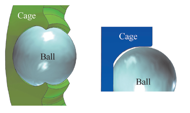 圖6 深溝球軸承的球與保持架接觸狀態(tài)(左-常規(guī);右-新開發(fā))