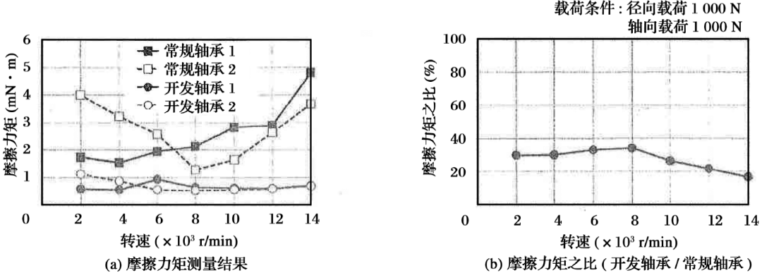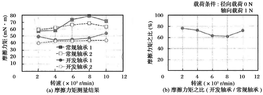 輕載條件下,在軸承摩擦力矩中潤滑脂的攪拌阻力及剪切阻力降低所占的比例大。至于使用新結構保持架,由于大幅降低潤滑脂的攪拌阻力及剪切阻力,軸承摩擦力矩降低效果明顯。