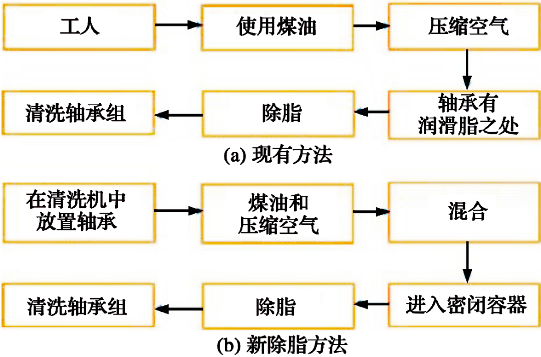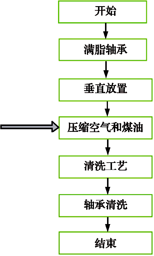 將圓柱滾子軸承拿到清洗區(qū),先使用煤油清洗,可去除軸承中的部分潤(rùn)滑脂。再使用壓力為0.8~ 1.0 MPa的壓縮空氣完全清洗,使用某潤(rùn)滑油公司的Servo gem 3和Lithon 3清洗軸承。此方法的主要弊端在于:清洗用的化學(xué)制品會(huì)對(duì)人體健康造成損害,且浪費(fèi)煤油和壓縮空氣;手工清洗花費(fèi)的時(shí)間也更多。新的清洗方法能提高安全性,減小工作強(qiáng)度,減少工作時(shí)長(zhǎng),降低人工成本,減少浪費(fèi)。其工作原理詳見第3.1節(jié)。