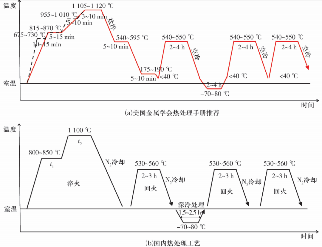 國內(nèi)外8Cr4Mo4V鋼傳統(tǒng)熱處理工藝均為淬火加三次回火,如圖1所示,區(qū)別在于國外淬火升溫過程為一步預(yù)熱(圖1a紅線)或三步預(yù)熱(圖1a黑色虛線),而國內(nèi)基本采用一步預(yù)熱(圖1b);國外淬火冷卻過程采用分級(jí)淬火方式,主要目的是減小熱處理變形,而國內(nèi)采用吹N2連續(xù)冷卻。