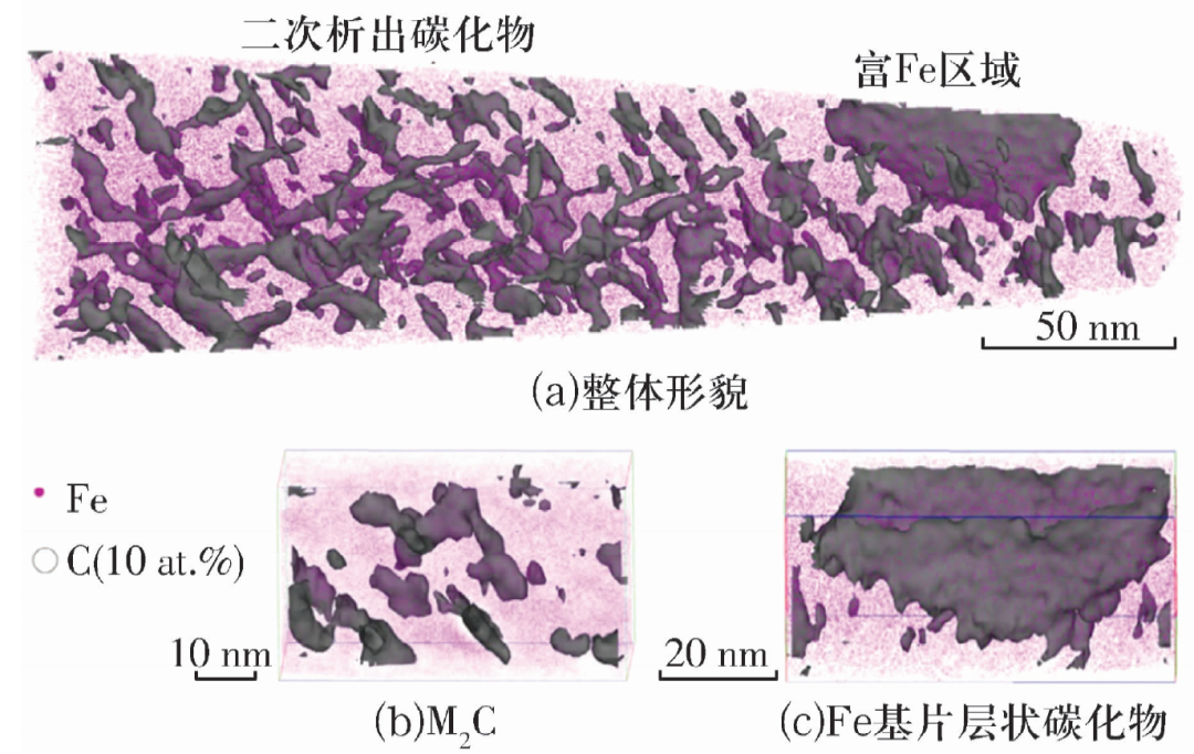 由文獻(xiàn)[8]可知,淬火未溶解碳化物的主要類型為M2C和MC,而回火析出碳化物主要類型為M23C6和M2C。通常,回火析出碳化物尺寸為納米級(jí),呈片狀或球狀,可起到二次硬化效果。然而,較早研究中受分析測試手段限制,只能從二維角度對(duì)8Cr4Mo4V鋼中碳化物進(jìn)行觀察分析,制樣以及觀察方式均可能導(dǎo)致對(duì)其真實(shí)形狀及尺寸存在誤判。隨著三維原子探針技術(shù)的開發(fā)及應(yīng)用,文獻(xiàn)[14]將其用于8Cr4Mo4V鋼中碳化物分析,結(jié)果如圖3所示,圖3b和圖3c為圖3a旋轉(zhuǎn)一定角度的局部放大,回火過程中析出的M2C三維形貌呈細(xì)柱狀,且連續(xù)彌散。