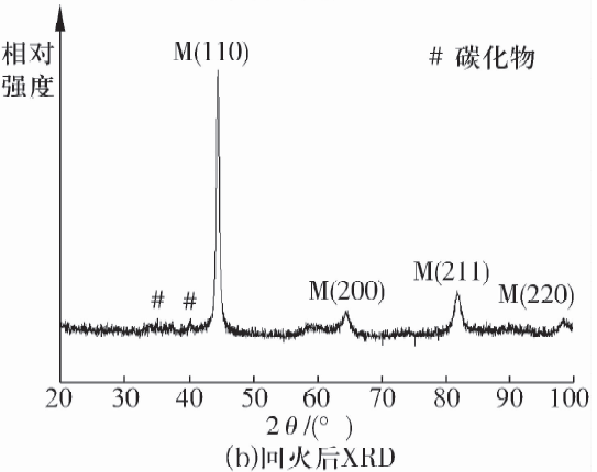 淬回火工藝處理后8Cr4Mo4V鋼微觀組織及物相如圖2所示:淬火后8Cr4Mo4V鋼的晶粒較為均勻、細(xì)小,回火后8Cr4Mo4V鋼由回火馬氏體、少量殘余奧氏體(體積分?jǐn)?shù)不大于3%)及碳化物組成;回火后存在無規(guī)則塊狀和彌散分布小顆粒狀碳化物,其中塊狀碳化物為淬火未溶解碳化物和回火析出碳化物。