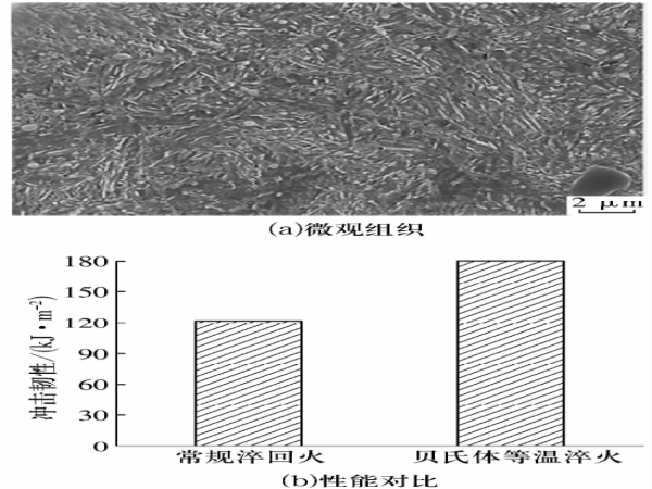 金屬材料通過等溫淬火獲得的下貝氏體具有優(yōu)異的強(qiáng)度和韌性,因此等溫淬火是目前較為常用的一種金屬增韌工藝。鑒于貝氏體優(yōu)異的力學(xué)性能,文獻(xiàn)[24-25]開展了8Cr4Mo4V鋼貝氏體等溫淬火工藝研究,以進(jìn)一步提高材料的強(qiáng)韌性。圖4a為貝氏體等溫淬火工藝處理后8Cr4Mo4V鋼的微觀組織,圖4b為貝氏體等溫淬火工藝與常規(guī)淬回火工藝的對(duì)比,貝氏體等溫淬火工藝可以顯著提高沖擊韌性,提高幅度可達(dá)20%~50%。