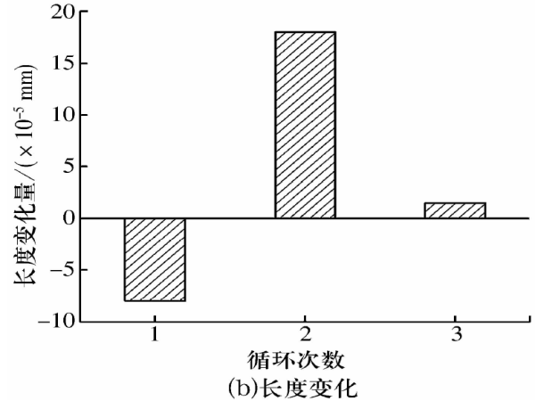 經(jīng)不同循環(huán)次數(shù)的穩(wěn)定化熱處理后,8Cr4Mo4V鋼( φ30 mm×20 mm)的殘余奧氏體含量及尺寸變化結(jié)果如圖6所示。由圖6a可知:正常熱處理后殘余奧氏體含量為2.61%,隨著尺寸穩(wěn)定化循環(huán)次數(shù)的增加,殘余奧氏體含量逐漸減少,經(jīng)3次循環(huán)后降低至0.76%。一次穩(wěn)定處理過程中馬氏體析出與殘余奧氏體轉(zhuǎn)變同時(shí)進(jìn)行,8Cr4Mo4V鋼尺寸整體呈收縮現(xiàn)象(圖6b),說明起主要作用的因素為馬氏體析出;二次及三次穩(wěn)定處理時(shí),由于馬氏體析出反應(yīng)基本完成,殘余奧氏體向馬氏體轉(zhuǎn)變成為引起尺寸變化的主要因素,因此呈現(xiàn)膨脹現(xiàn)象,且隨著循環(huán)次數(shù)的增加,殘余奧氏體含量降低,尺寸膨脹量也隨之減小。由圖6b可知,經(jīng)三次循環(huán)處理后,8Cr4Mo4V鋼試樣長度平均增加1.5X10-5 mm,變化率為7.5x10-7。