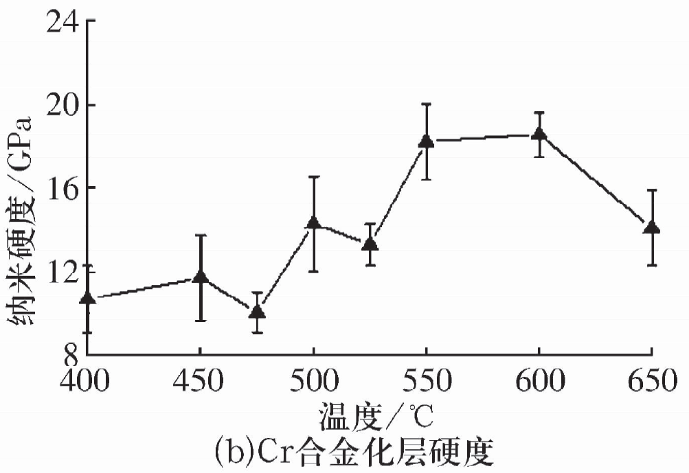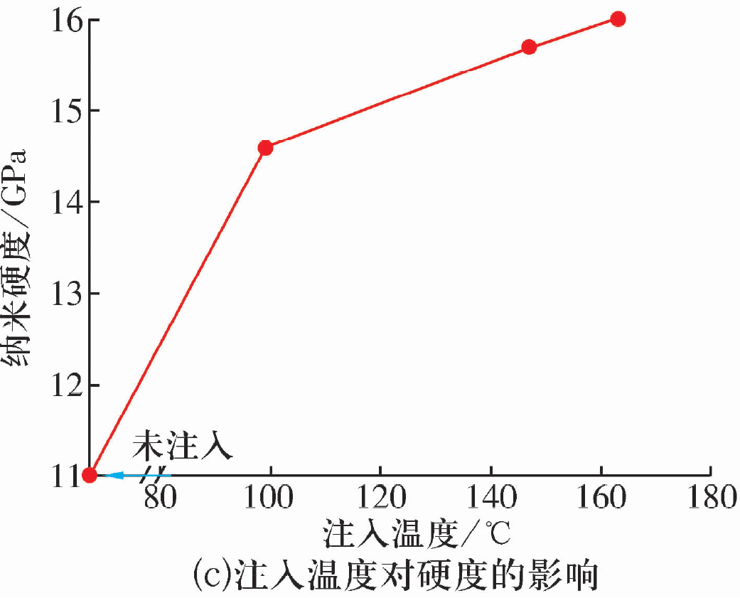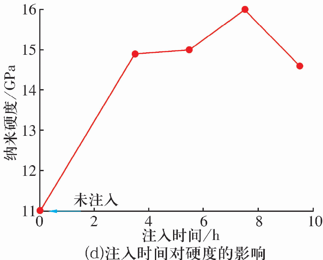 文獻(xiàn)[35]采用N元素等離子體離子注入技術(shù)對(duì)8Cr4Mo4V鋼進(jìn)行表面改性,獲得了厚度達(dá)22 μm的改性層,并深入研究離子注入?yún)?shù)對(duì)其組織、性能的影響規(guī)律及機(jī)制,結(jié)果如圖10所示,注入層的納米硬度相較于8Cr4Mo4V鋼基體可提高45%,可顯著提高材料的耐磨性能;且離子注入過(guò)程可在8Cr4Mo4V鋼表面引入一定的殘余壓應(yīng)力。
