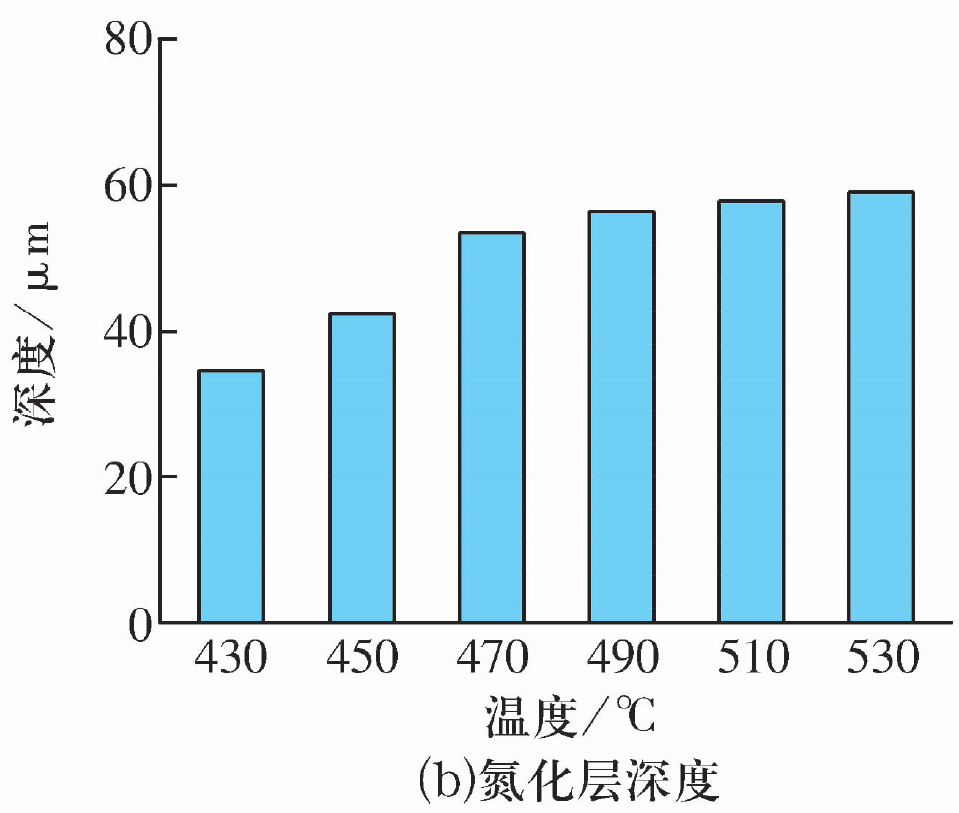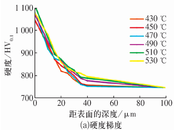 文獻(xiàn)[27]進(jìn)行了8Cr4Mo4V鋼離子滲氮研究工作,利用陽(yáng)極層離子源輔助滲氮技術(shù)在不同溫度下進(jìn)行8Cr4Mo4V鋼氮化處理,材料表面硬度梯度及滲氮層深度如圖7a和圖7b所示。由圖7可知:隨著滲氮溫度的升高,滲氮試樣的表面硬度略微增加,最高表面硬度達(dá)1 100 HV0.1;滲氮溫度的升高使氮原子擴(kuò)散系數(shù)增加,導(dǎo)致530 ℃的滲層深度比430 ℃的增加了近一倍。但8Cr4Mo4V鋼氮化層深度較淺不能滿足8Cr4Mo4V鋼性能提升需求;進(jìn)行工藝改進(jìn)后,8Cr4Mo4V鋼氮化層深度達(dá)120 μum,這將大大提升8Cr4Mo4V鋼抗疲勞性能。