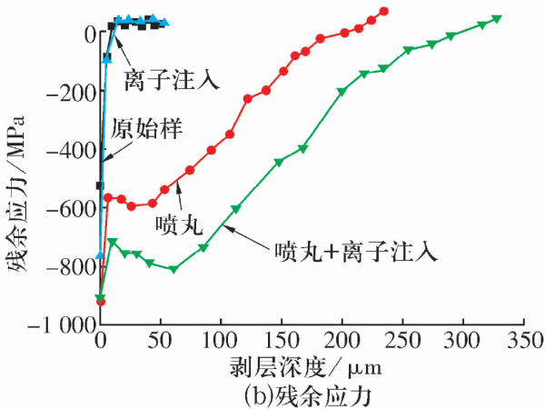 復(fù)合處理后8Cr4Mo4V鋼表面N元素分布和應(yīng)力梯度結(jié)果如圖15所示,單一離子注入處理后8Cr4Mo4V鋼改性層深度僅約5 μm,而復(fù)合處理后8Cr4Mo4V鋼表面氮濃度遠(yuǎn)高于僅離子注入試樣,且在30 μm處N原子數(shù)分?jǐn)?shù)仍超過(guò)10%;盡管單一離子注入處理對(duì)應(yīng)力幾乎無(wú)影響,但其與噴丸處理耦合時(shí)卻可以大幅增加壓應(yīng)力的幅值和深度。文獻(xiàn)[47]認(rèn)為這是由于噴丸產(chǎn)生的缺陷為N原子向試樣內(nèi)部快速擴(kuò)散提供了通道,而N原子以過(guò)飽和固溶體存在于晶格和缺陷中,使點(diǎn)陣膨脹形成附加壓應(yīng)力,提高了噴丸強(qiáng)化效果。