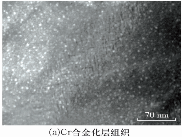 強(qiáng)流脈沖電子束表面合金化技術(shù)通常包括2個(gè)過(guò)程:首先在材料表面進(jìn)行鍍膜處理,然后利用高能電子束轟擊材料表面,從而改變材料表面熔化層,產(chǎn)生成分和組織結(jié)構(gòu)變化,提高材料表面的力學(xué)性能和耐蝕性[29]。文獻(xiàn)[30-33]利用電子束合金化技術(shù)分別在8Cr4Mo4V鋼表面制備了Cr和Ta合金化層。經(jīng)表面合金化和后續(xù)回火處理后,合金化層微觀組織及表面硬度如圖9所示:8Cr4Mo4V鋼表面析出大量尺寸僅有幾個(gè)納米的顆粒,由于納米顆粒析出強(qiáng)化效應(yīng),回火后Ta和Cr合金化層的最大硬度分別達(dá)到17.3,18.2 GPa,相較于基體的11 GPa,提高幅度達(dá)57%和65%。