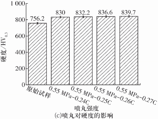經(jīng)不同噴丸強(qiáng)度處理后8Cr4Mo4V鋼表面殘余應(yīng)力如圖14a所示,殘余壓應(yīng)力對(duì)噴丸強(qiáng)度不敏感。鋼丸直徑對(duì)材料殘余應(yīng)力的影響如圖14b所示,增加鋼丸直徑可在8Cr4Mo4V鋼表面引入更高的殘余壓應(yīng)力。8Cr4Mo4V鋼在不同噴丸強(qiáng)度下的表面顯微硬度如圖14c所示,與未處理試樣相比,噴丸后材料顯微硬度呈增加趨勢(shì),最大增幅為11.1%。