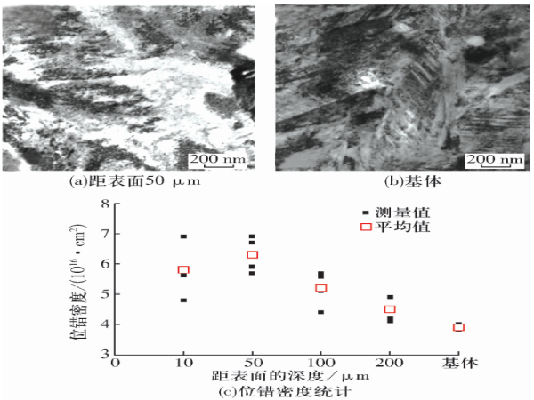 噴丸強(qiáng)化是一種應(yīng)用較為普遍的低成本表面處理技術(shù),可使材料表面發(fā)生不均勻塑性變形,產(chǎn)生壓應(yīng)力,形成應(yīng)變強(qiáng)化層和殘余壓應(yīng)力層。文獻(xiàn)[35]開展了8Cr4Mo4V鋼表面噴丸強(qiáng)化技術(shù)研究,并深入探討了相關(guān)機(jī)制。噴丸強(qiáng)化層距表面50 μm處和基體的TEM衍射襯度像分別如圖13a和圖13b所示,可以看出噴丸導(dǎo)致表層馬氏體發(fā)生強(qiáng)烈塑性變形,導(dǎo)致強(qiáng)化層的板條馬氏體邊界較為模糊,而基體板條界面清晰。噴丸強(qiáng)化層距表面不同深度處的{111}晶面上位錯(cuò)密度統(tǒng)計(jì)結(jié)果如圖13c所示,噴丸強(qiáng)化層位錯(cuò)密度較基體高約1倍,并且隨深度增加逐漸下降。