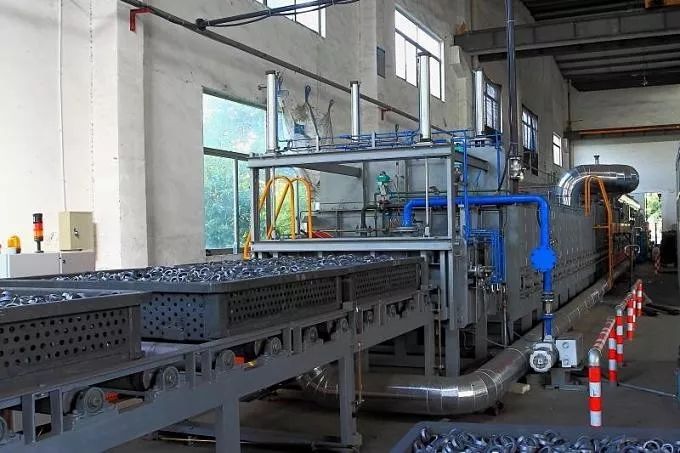 淬回火設(shè)備通常也使用保護(hù)氣氛爐型如鑄鏈爐、網(wǎng)帶爐或推桿爐,如圖9b所示,生產(chǎn)效率高、能耗低,常見的國內(nèi)生產(chǎn)廠家有江蘇豐東、北方工業(yè)、杭州金舟等。