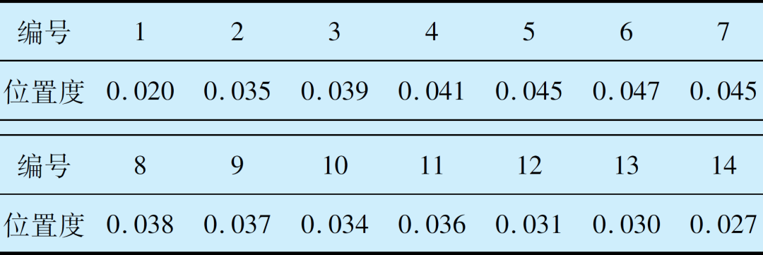 某型軸承半保持架鉚釘孔孔徑為0.7 mm, 14等分,中心徑公稱尺寸為(41.9±0.04)mm,位置度要求為0.03 mm。由未修正的測量結(jié)果(表1)可知選取任意一個(gè)孔作為基準(zhǔn)進(jìn)行評價(jià),其余孔呈一定規(guī)律性變化,基準(zhǔn)孔位置度較小,依次增大后變小(圖3)。