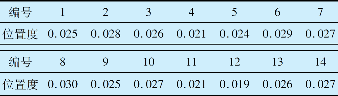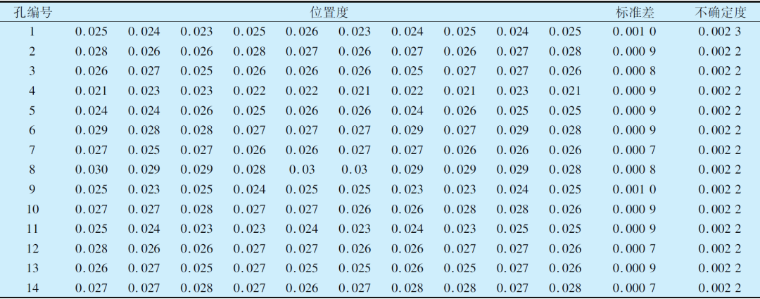 為驗(yàn)證該方法的可靠性,對該型號(hào)軸承半保持架孔位置度重復(fù)測量10次,并計(jì)算測量數(shù)據(jù)的平均值及標(biāo)準(zhǔn)差,結(jié)果見表3:14個(gè)孔位置度測值的標(biāo)準(zhǔn)差最大為0.001 mm,離散性較低,測量數(shù)值可靠;測值不確定度不超過0.003 0 mm,同樣說明該方法的測值準(zhǔn)確可靠。