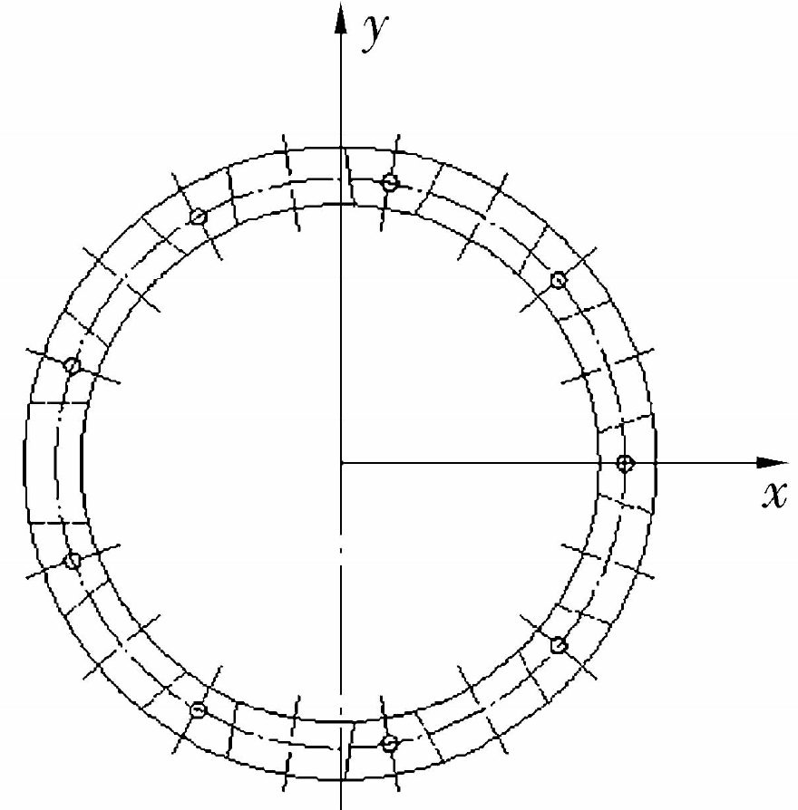 假設(shè)分離型半保持架鉚釘孔10等分,則鉚釘孔極角公稱值α=360°/10=36°。設(shè)測量后鉚釘孔各孔的極徑、極角分別為Di,βi,則各孔極角偏差θi為