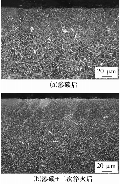 要消除已形成的網(wǎng)狀碳化物,最有效的方法是進(jìn)行二次淬火。對(duì)表層中的細(xì)網(wǎng)狀或半連續(xù)稍粗的晶界碳化物,可適當(dāng)提高二次淬火溫度或者延長(zhǎng)固溶保溫時(shí)間以促進(jìn)大尺寸碳化物充分溶解,之后的冷卻過程中冷速要足夠快,從而抑制晶界碳化物析出。但特別粗大的網(wǎng)狀碳化物無法通過二次淬火徹底消除,如圖4所示,在二次淬回火后仍存在較嚴(yán)重的網(wǎng)狀碳化物,所以在滲碳過程中應(yīng)避免出現(xiàn)粗大網(wǎng)狀碳化物。經(jīng)950 ℃滲碳緩冷后的G13Cr4Mo4Ni4V鋼表面存在斷續(xù)的網(wǎng)狀碳化物,如圖5所示,而在經(jīng)過1 100 ℃真空氣淬后,網(wǎng)狀特征消失,這是因?yàn)楦籑o/Cr碳化物在1 100 ℃的高溫下充分溶解,氣冷過程中碳化物沒有再沿晶界析出。