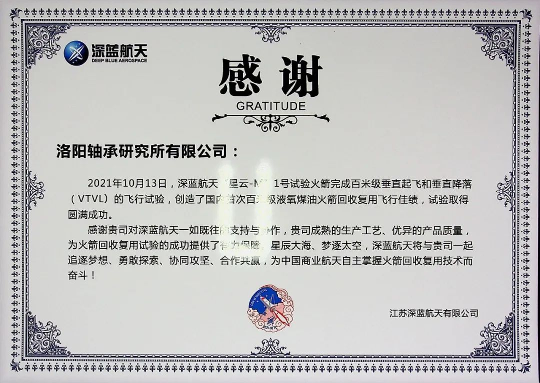 近日,洛陽軸承研究所有限公司(以下簡(jiǎn)稱“軸研所”)收到江蘇深藍(lán)航天有限公司(以下簡(jiǎn)稱“深藍(lán)航天”)發(fā)來的感謝信,信中深藍(lán)航天對(duì)軸研所在“星云-M”1號(hào)試驗(yàn)箭成功完成百米級(jí)垂直起飛及降落(VTVL)飛行試驗(yàn)中提供的有力配套保障表示衷心感謝。