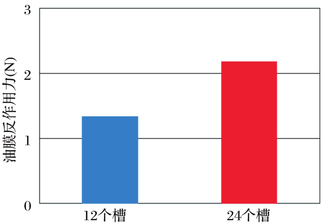 帶12和24個(gè)V形潤(rùn)滑槽密封圈的油膜反作用力如圖7所示。正如所估計(jì)的,槽數(shù)越多,油膜反作用力越大。因此,槽數(shù)越多,摩擦力矩降低越多。