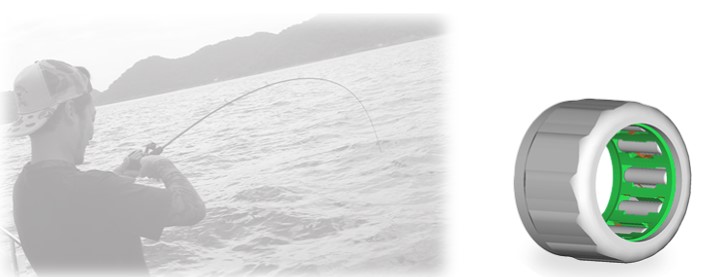 應(yīng)用在釣具漁輪中魚線回收止逆機(jī)構(gòu)的小型單向軸承,采用樹脂材料保持架,軸承外圈使用沖壓加工方式減少外圈厚度,實(shí)現(xiàn)減輕軸承重量,進(jìn)而實(shí)現(xiàn)漁輪的輕量化。
