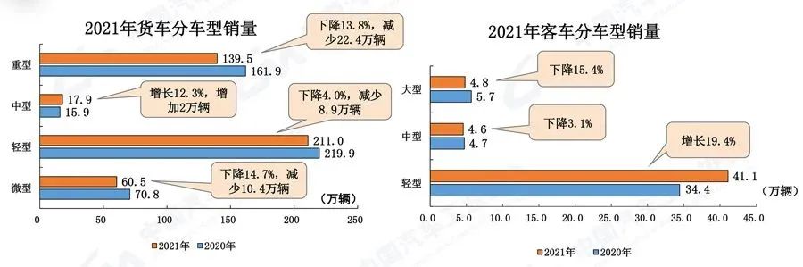 從2021年客貨細(xì)分車型產(chǎn)銷情況看,貨車中,重型貨車、輕型貨車以及微型貨車減量都較大,其中重型貨車減量最大;客車中,輕型客車的增長拉動(dòng)了整體客車產(chǎn)銷的增長。