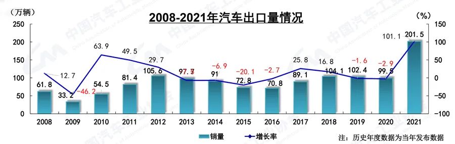 按照整車企業(yè)出口統(tǒng)計(jì)口徑,2021年全年汽車出口201.5萬輛,同比增長1倍,占汽車銷售總量的比重為7.7%,比上年提升3.7個(gè)百分點(diǎn)。其中,乘用車出口161.4萬輛,同比增長1.1倍;商用車出口40.2萬輛,同比增長70.7%。