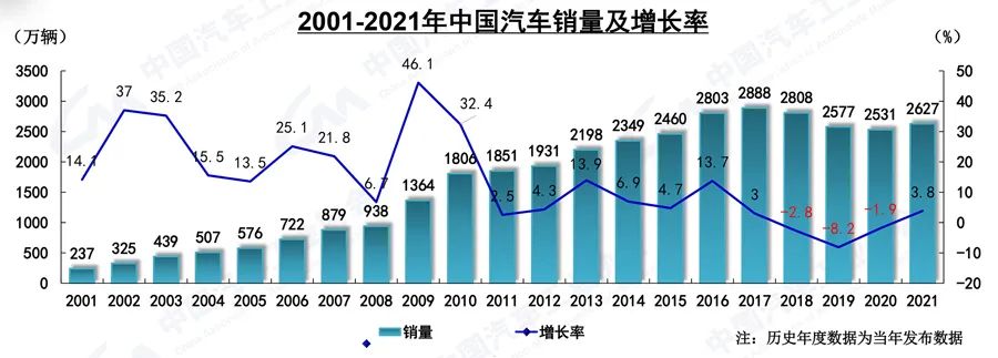 2021年,全年汽車產(chǎn)銷分別完成2608.2萬輛和2627.5萬輛,同比增長3.4%和3.8%。