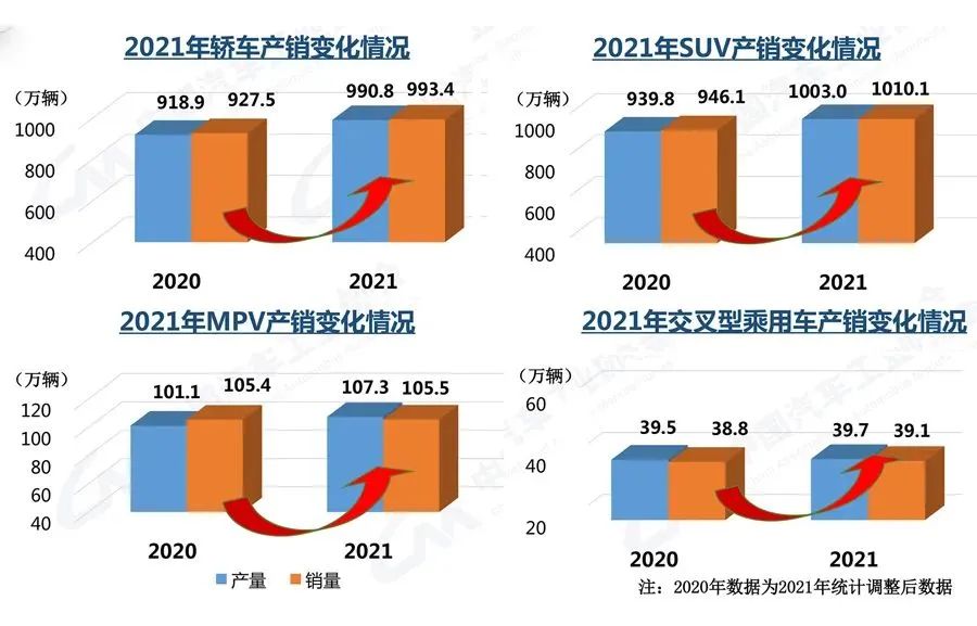 在國內(nèi)強(qiáng)大的消費(fèi)市場(chǎng)促進(jìn)下,我國乘用車市場(chǎng)已經(jīng)連續(xù)七年超過2000萬輛。從細(xì)分車型來看,2021全年轎車、SUV、MPV、交叉型乘用車等四類車型產(chǎn)銷均呈現(xiàn)增長。