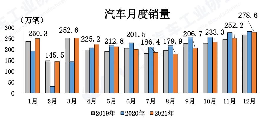 12月,汽車產(chǎn)銷分別完成290.7萬輛和278.6萬輛,環(huán)比分別增長12.5%和10.5%,產(chǎn)量同比增長2.4%,銷量同比下降1.6%。與2019年同期相比,產(chǎn)銷同比分別增長8.2%和4.7%,其中產(chǎn)量增速較11月由負(fù)轉(zhuǎn)正,銷量增速比11月擴(kuò)大2.2個(gè)百分點(diǎn)。