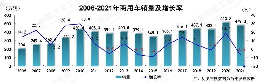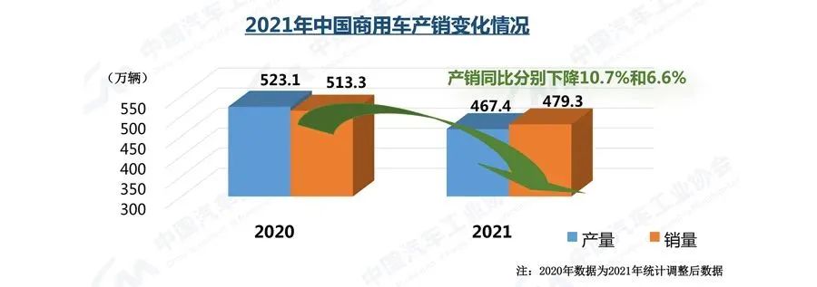 2021年,商用車產(chǎn)銷分別完成467.4萬輛和479.3萬輛,同比下降10.7%和6.6%??蛙嚾戤a(chǎn)銷結(jié)束了前幾年的下降態(tài)勢(shì),有所回升,產(chǎn)銷同比呈現(xiàn)增長;貨車全年產(chǎn)銷同比呈現(xiàn)下降。