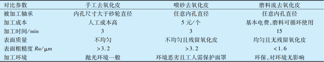 基于上述試驗(yàn)結(jié)果,將磨料流去氧化皮方法與傳統(tǒng)手工和噴砂去氧化皮進(jìn)行對(duì)比,結(jié)果見(jiàn)表1,采用磨料流加工方法去除氧化皮的經(jīng)濟(jì)性和加工質(zhì)量均明顯優(yōu)于其他2種,且磨料流加工法更環(huán)保,但加工效率略低于其他2種。