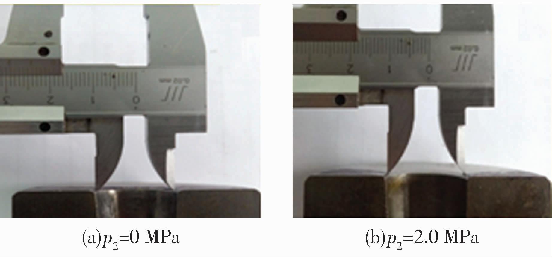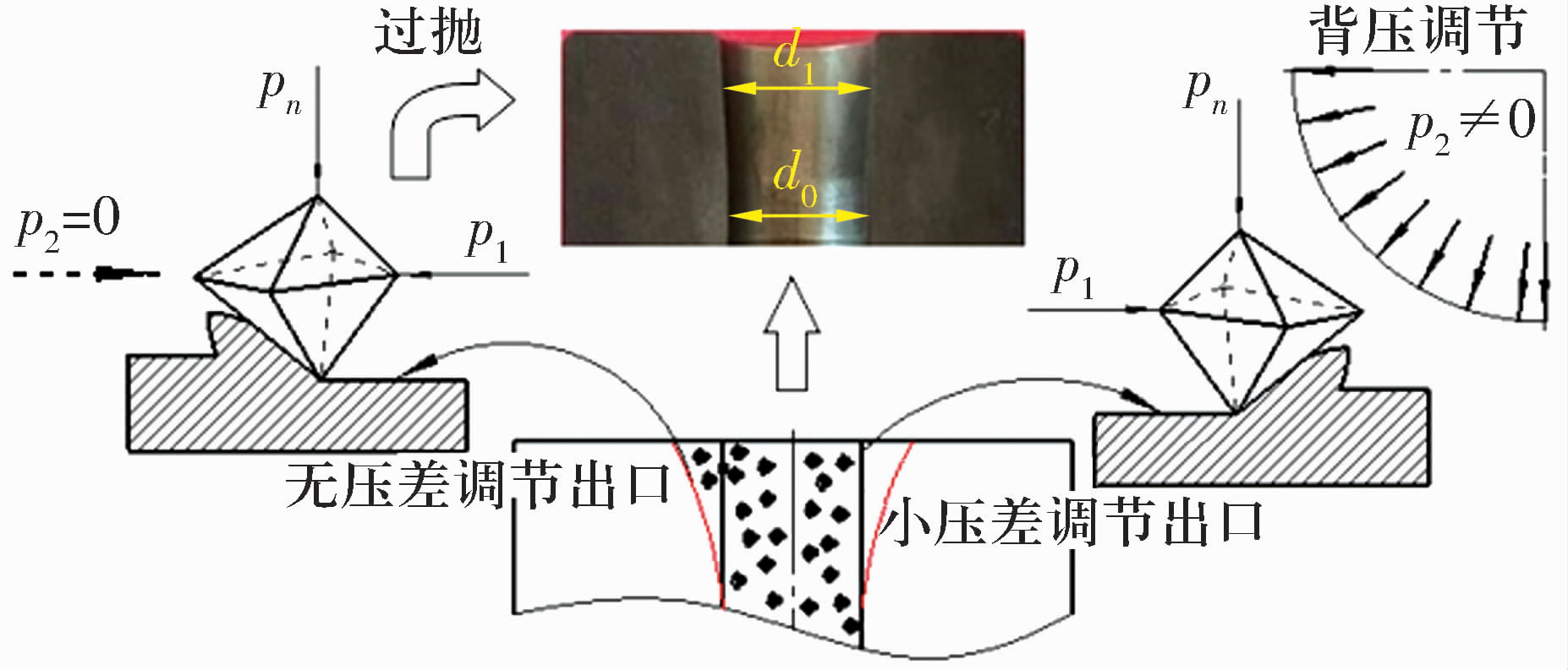 在上述無(wú)背壓的“穿膛過(guò)”磨粒流加工條件下,將加工后的工件線切割開(kāi),可以明顯看出進(jìn)出口處的尺寸d1,大于中間區(qū)域的尺寸d0,并形成“喇叭口”。出現(xiàn)該結(jié)果的主要原因是由于黏彈性磨料在出口處的突然擠入與釋放時(shí)形成的擠壓壓力過(guò)大,從而在工件兩端出現(xiàn)嚴(yán)重的過(guò)拋現(xiàn)象,嚴(yán)重影響空心滾子的尺寸。為避免“喇叭口”的形成,應(yīng)該控制進(jìn)出口的壓差,使磨粒流在加工過(guò)程中實(shí)現(xiàn)均勻的擠壓運(yùn)動(dòng)。因此,在擠壓過(guò)程中對(duì)磨粒流施加一個(gè)回程壓力,即背壓P2與“穿膛過(guò)”式(背壓P2為零)的情況相比,在擠壓過(guò)程中增加磨料流回程壓力,可以降低壓力在進(jìn)出口處的突變,實(shí)現(xiàn)進(jìn)出口處壓力的小壓差調(diào)節(jié),從而有效抑制“喇叭口”的形成,其原理如圖6所示。