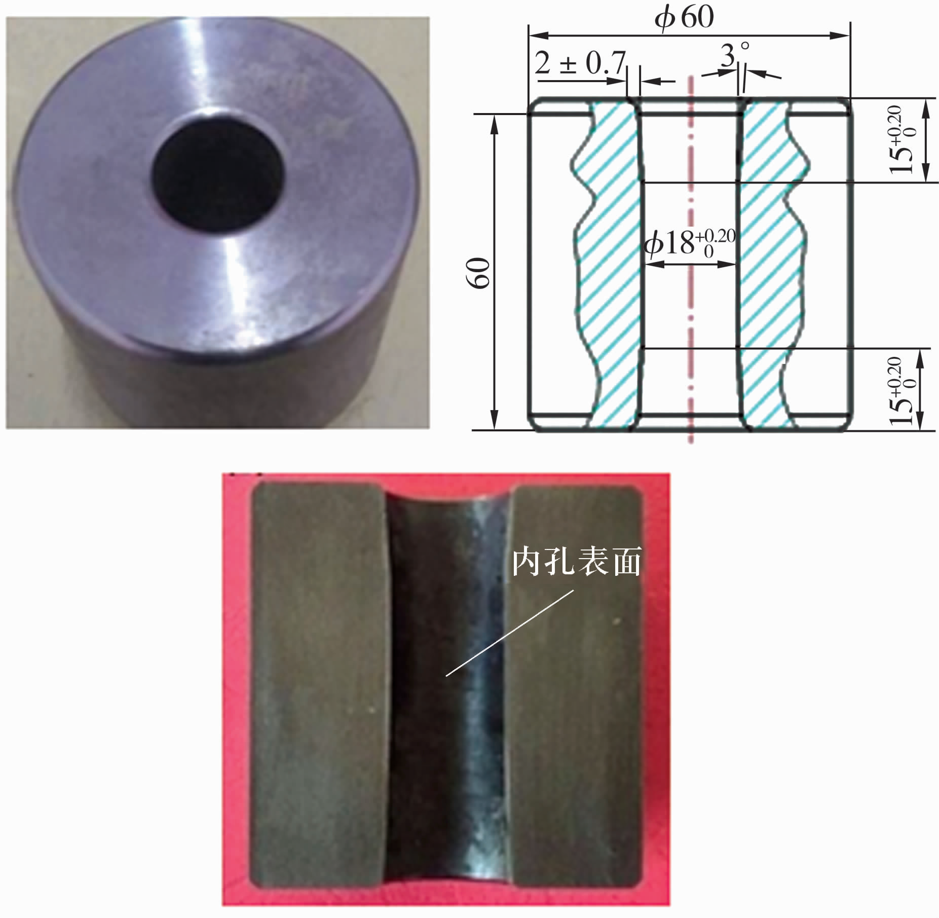 空心滾子試樣材料為GCr15,尺寸為φ60 mm×φ18 mm×60 mm。由于在熱處理過(guò)程保護(hù)氣氛的作用下,熱處理后可以清晰地看到厚薄不均勻的黑色氧化皮,且去除困難??招臐L子線切割后主要尺寸及內(nèi)孔表面的氧化皮如圖3所示。