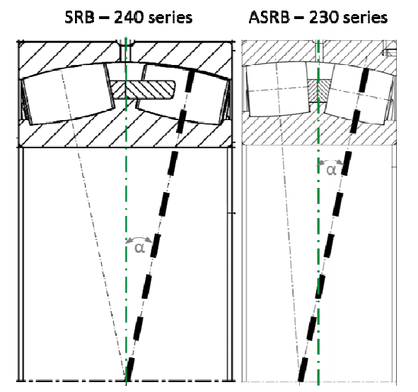 通過設(shè)置兩列滾動體的接觸角不同來滿足單向承載的需求。在與傳統(tǒng)對稱式結(jié)構(gòu)相比,該設(shè)計能在相同外形尺寸下,有效提高軸承軸向承載能力和剛度,從而一定程度上有效避免了另外一列滾動體打滑的風(fēng)險。對于風(fēng)電應(yīng)用來說,往往選擇240系列軸承是因為可以設(shè)計更大的接觸角以增大軸向承載能力,非對稱設(shè)計可以充分利用風(fēng)力的單向性,提高對齒輪箱側(cè)的接觸角增大可行性,可以使用230系列去替代240系列軸承,如圖所示,以此來減小軸承的尺寸。