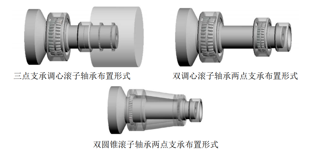 目前已裝機的風(fēng)力發(fā)電機中,大多數(shù)采用主軸軸承支撐結(jié)構(gòu),其主軸軸承一般分為兩點支撐和三點支撐的布置形式。
