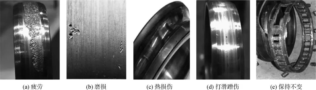 主軸軸承運行在極端苛刻工況及復(fù)雜環(huán)境條件下,失效形式十分復(fù)雜且可能出現(xiàn)多種失效并存。主軸軸承的主要失效模式包括疲勞、磨損、熱損傷、打滑蹭傷、保持架失效等[15],如圖1所示。