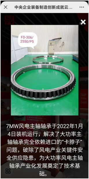 軸研所研制的7 MW風(fēng)電主軸軸承作為國機(jī)集團(tuán)展區(qū)的主要展覽項目,吸引了廣大線上參觀者的目光。7 MW級海上風(fēng)電主軸承作為風(fēng)力發(fā)電機(jī)的核心零部件,載荷復(fù)雜多變,軸承可靠性及精度要求高,且設(shè)計壽命需達(dá)到25年以上,技術(shù)難度大,長期被國外軸承企業(yè)壟斷。公司通過多次試驗,不斷攻關(guān),相繼攻克軸承材料優(yōu)選、熱處理工藝改善、保持架優(yōu)化設(shè)計與加工等方面技術(shù)難題,成功研制7 MW大功率風(fēng)電主軸軸承,并于2022年1月4日裝機(jī)運行,解決了大功率主軸軸承完全依賴進(jìn)口的“卡脖子”問題。