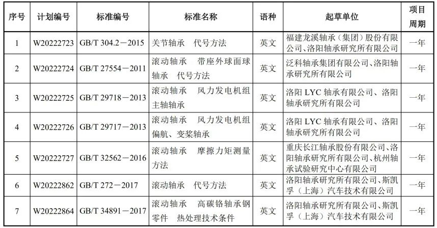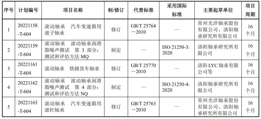 2022年12月13日,國家標準化管理委員會以國標委發(fā)[2022]39號文下達了2022年第三批行推薦性國家標準計劃及相關(guān)標準外文版計劃。本批推薦性國家標準計劃共計582項,其中滾動軸承領(lǐng)域5項,如下表所示:
