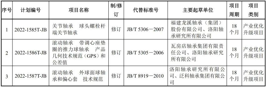 2022年11月22日,工業(yè)和信息化部以工信廳科函[2022]312號文下達了2022年第三批行業(yè)標準制修訂項目計劃。本次共安排項目計劃971項,其中滾動軸承領(lǐng)域3項,如下表所示: