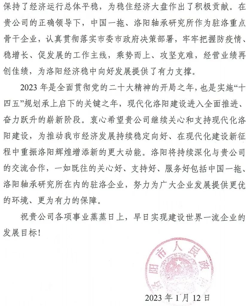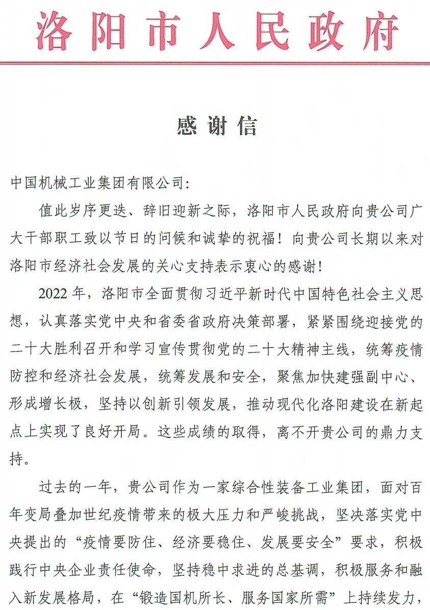 1月12日,國機集團收到洛陽市人民政府發(fā)來的感謝信,信中充分肯定了軸研所面對世紀(jì)疫情帶來的巨大沖擊,迎難而上,勠力同心,再創(chuàng)佳績,為洛陽經(jīng)濟穩(wěn)中向好發(fā)展提供了有力支撐。