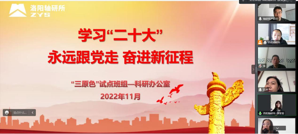 由于近日疫情形勢(shì)復(fù)雜,軸研所科研管理辦公室全體成員,積極響應(yīng)政府與公司號(hào)召,以居家辦公的形式居守小家、顧全大家,積極創(chuàng)新辦公、溝通形式,確保了疫情防控和部門工作的正常運(yùn)轉(zhuǎn)。在居家辦公期間,科研辦公室作為國(guó)機(jī)精工“三原色”試點(diǎn)班組,不忘提升班組成員的政治理論水平,特開展了學(xué)習(xí)“二十大”的線上會(huì)議,學(xué)習(xí)及探討黨的二十大有關(guān)科技創(chuàng)新方面的內(nèi)容。