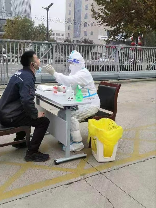 核酸檢測剛一開始,另一名志愿者因特殊情況不能參加采樣,第一產(chǎn)業(yè)園區(qū)的采樣任務(wù)都由袁茜茜一個人承擔(dān)。天氣漸漸變冷,每為一個員工采樣,就需要做一次手部消毒,采樣開始沒多久,袁茜茜的手就被凍麻木了,防護(hù)罩上不斷出現(xiàn)一層一層的水蒸氣,視線一片模糊……諸多困難,袁茜茜都咬牙堅持了下來,面對日復(fù)一日的辛苦和危險,她無怨無悔,只想盡自己所能幫助他人、服務(wù)社會。