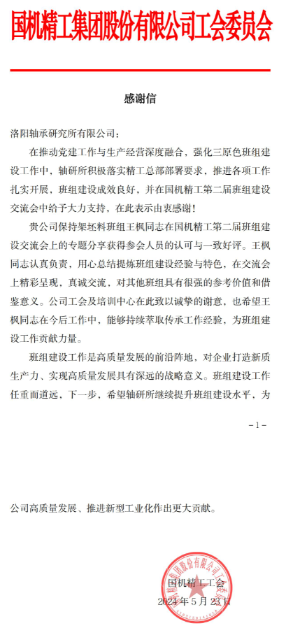近日,公司收到國機精工工會發(fā)來的感謝信,信中充分肯定了公司扎實推進“三原色”班組建設(shè)取得的良好成效,對公司在國機精工第二屆班組建設(shè)交流會中給予的大力支持以及保持架坯料班組王楓的精彩分享表示感謝。