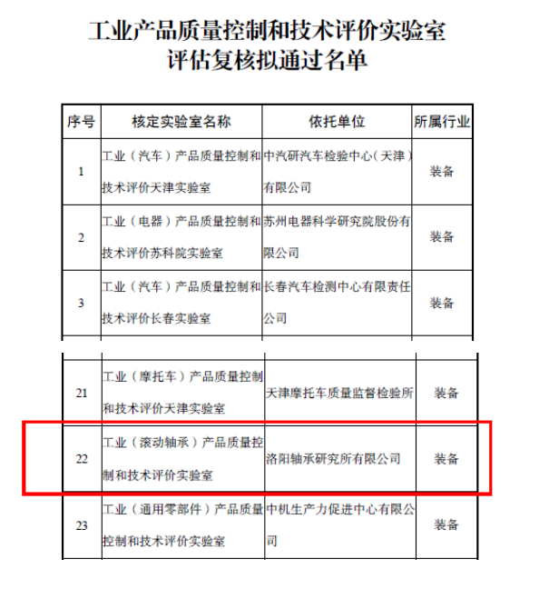 日前,工業(yè)和信息化部辦公廳組織開(kāi)展了工業(yè)產(chǎn)品質(zhì)量控制和技術(shù)評(píng)價(jià)實(shí)驗(yàn)室評(píng)估復(fù)核工作,經(jīng)評(píng)審,軸研所工業(yè)(滾動(dòng)軸承)產(chǎn)品質(zhì)量控制和技術(shù)評(píng)價(jià)實(shí)驗(yàn)室(以下簡(jiǎn)稱“實(shí)驗(yàn)室”)成功通過(guò)復(fù)核。