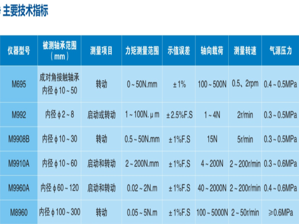 公司根據(jù)有關(guān)標(biāo)準(zhǔn)和用戶要求研制開(kāi)發(fā)了系列軸承摩擦力矩儀,適用于軸承制造和使用單位計(jì)量室對(duì)精密軸承旋轉(zhuǎn)靈活性的檢測(cè),以及檢測(cè)機(jī)構(gòu)對(duì)送檢軸承的質(zhì)量認(rèn)定。適用于深溝球、角接觸、單列圓錐、關(guān)節(jié)、輪轂、成對(duì)角接觸等各種類(lèi)型的微型、中小型、大型軸承的啟動(dòng)和動(dòng)態(tài)摩擦力矩測(cè)量。