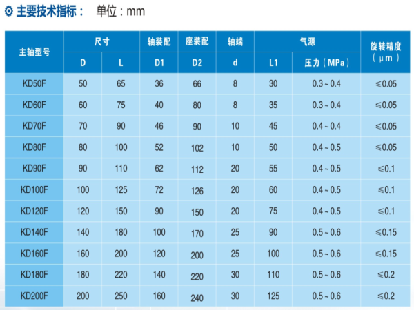 注: 1.空氣軸承無凸緣系列與上述尺寸基本相同,型號(hào)后不帶F (無座裝配尺寸D2 ) ;